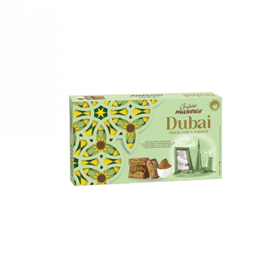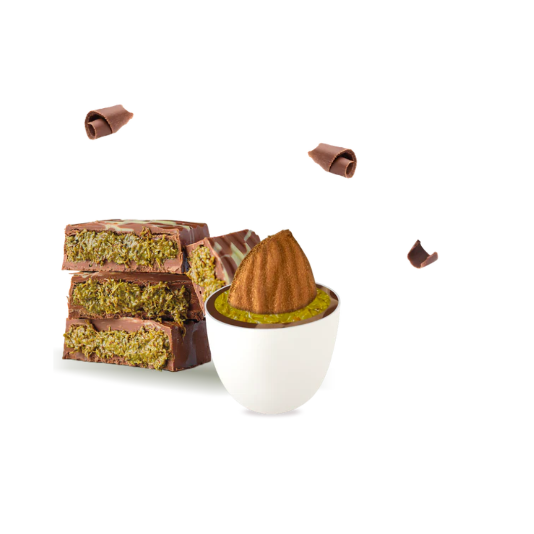 Cioccolato bianco con pasta di pistacchio (42,9%) (zucchero, latte intero in polvere, burro di cacao, pasta di pistacchio 10%, emulsionante: lecitina di soia, aroma naturale di vaniglia, colorante: E133, E100), cioccolato al latte (20%) (zucchero, latte intero in polvere 22,5%; burro di cacao, pasta di cacao, emulsionante: lecitina di soia, aroma naturale di vaniglia), mandorla tostata (18%), zucchero, pasta kadayif (1%) (farina di frumento, acqua), amido di riso, maltodestrina, colorante: E170. Agenti di rivestimento: cera carnauba (E903), cera d’api (E901).